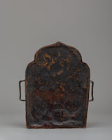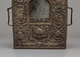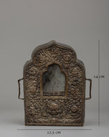 This Ghau Box, 14 cm tall, 12.5 cm wide, and weighing 0.21 kg, is a lightweight yet durable example of Tibetan handicraft. Its firm but elegant design assures longevity while serving an aesthetic and spiritual function. The box also has two handles on the sides, which allow it to be conveniently moved or put in a sacred spot. This practical yet elegant piece is an excellent addition to any collection, especially for those who appreciate Tibetan culture or Buddhist items.