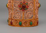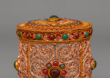 This gorgeous traditional treasure box is a work of art, blending filigree art with the meticulous placing of artificial stones to create a genuinely exceptional decorative piece. This box's complex workmanship, made of copper and silver-plated, demonstrates the artists' expertise and precision. The filigree ornamentation comprises tiny, lace-like patterns carved into the body, resulting in swirling designs that provide depth and refinement to the overall design. These decorative designs give it an appearance of history and grandeur, elevating it above a storage box and into a piece of heritage.