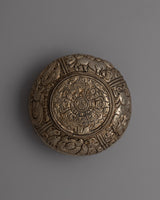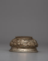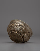 This gorgeous antique White Metal offering bowl is precisely created to embody the qualities of prosperity, fertility, and spiritual nourishment. Designed with traditional Buddhist principles, this rice bowl represents abundance and happiness and is frequently seen in the Buddha's hands. Its size of 6cm in height and 11.5cm in circumference makes it an adaptable addition to your meditation altar or home shrine.