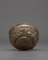 This bowl's silver body and beautiful antique finish exemplify precise craftsmanship and timeless design. Historically, it has been used by Buddhist monks to make contributions, but it still inspires acts of generosity and spiritual meditation. This offering bowl, whether used as a functional shrine piece or as a decorative object, is essential to any sacred area, promoting peace and success in your life.