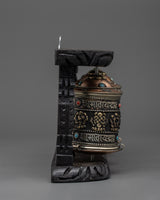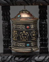 Each wheel has been engraved with the potent mantra "Om Mani Padme Hum," which is thought to evoke compassion and knowledge. Spinning these wheels represents repeating the phrase, offering blessings, and removing negative energy. The addition of artificial turquoise and coral stones adds visual depth while respecting traditional Tibetan creativity. The mix of metals and wood emits power and warmth, expressing the balance between the spiritual and material worlds.