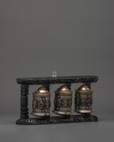 This finely handcrafted Triple Tibetan Prayer Wheel Set makes a meaningful and elegant addition to your spiritual practice or Zen altar decor. This set, which measures 15.5 cm in height and 28.5 cm in width, includes three distinct mantra wheels made of copper, brass, and white metal. This sacred piece, set on a finely carved wooden frame and weighing 0.62kg, is ideal for hanging in meditation rooms, entryways, or holy altars.