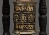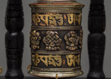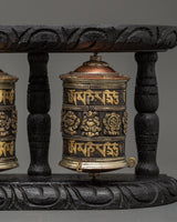 These three copper-bodied prayer wheels, expertly placed in a hand-carved black hardwood frame, rotate smoothly and generate colorful spiritual energy. Each wheel is embellished with auspicious symbols and gilded inscriptions, bringing tranquility, protection, and mindfulness into your everyday routine. Ideal for home altars, meditation rooms, or as a meaningful present, this triple set multiplies spiritual merit and blessings with each spin, making it a beloved artifact in Tibetan Buddhist practice.
