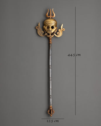 Handcrafted Trishul, a formidable Hindu trident made of copper, brass, and iron. This sacred symbol, 44.5 cm tall and 12.5 cm wide, depicts spiritual enlightenment and the balance of creation, preservation, and protection. The Trishul (trident) is an important feature of Hindu mythology, representing the three fundamental aspects of existence: past, present, and future.