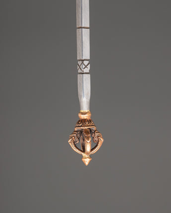 Ritual tools are vital to Tibetan Vajrayana Buddhism practice and are meant to dispel misconceptions that obstruct enlightenment. The phurba (Sanskrit: Kila) blade seen here was created to symbolically swallow the three poisons that hinder spiritual progress: ignorance, greed, and illusion. The Phurba is the physical manifestation of the Vajrakila Buddha, who can destroy all evil on the earth. Its ceremonial usage is first recorded in the Vajrakilaya Tantra, an eighth-century or older Vajrayana work.