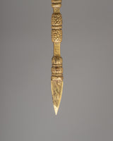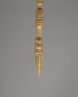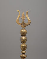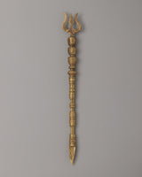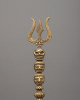 This (three-pronged spear) Trishul with a dagger is crafted from brass and features a remarkable combination of sacred and elegant art. The top of the Trishul has three sharp prongs, symbolizing divine protection, each meticulously sharpened with intricate detail. Multiple skull motifs are stacked at the weapon's center, representing the destruction of ignorance and the transformation of negative energies. These skulls add a layer of spiritual significance, reflecting the wrathful deities often invoked in rituals.
