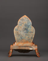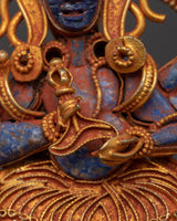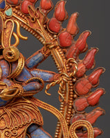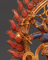 In Buddhism, Mahakala is adored as a protector deity, representing the fierce compassion required to overcome obstacles on the way to enlightenment. The Six-Armed Mahakala symbolizes his omnipotence in protecting practitioners from evil energies. His turquoise body represents peace and wisdom, while the numerous arms bearing ritual artifacts represent his ability to cut through ignorance and illusions. The blazing halo around Mahakala represents his wrathful might, expelling darkness and guiding devotees to spiritual awareness.