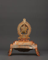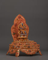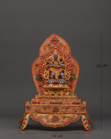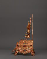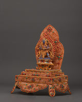 Our Six-Armed Mahakala statue is a stunning example of Tibetan Buddhist art, handcrafted from copper with a silver-plated finish. The deity is standing on an artistically carved filigree-style throne, 34 cm tall and 26 cm wide, weighing 1.492 kg. The meticulous workmanship and fine inlays of imitation Ruby, Panna, and Turquoise stones add to the statue's holy atmosphere, making it an exceptional spiritual collectible and altar centerpiece.