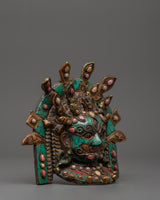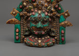 This handcrafted Turquoise Coral Wall Hanging Mask will bring heavenly energy into your sacred protection. This bold and detailed mask, 20cm wide and 17.5cm tall, shows powerful protective expressions commonly associated with wrathful deities in Himalayan spiritual traditions. Its brass body, set with Artificial turquoise and coral stones, produces a bright and magical aura, making it ideal for home altars, temple walls, and meditation places.