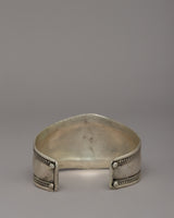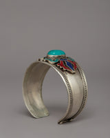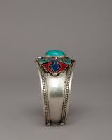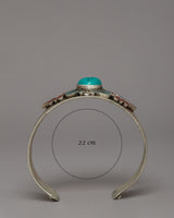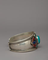 Our Turquoise Engraved Bracelet, handcrafted perfectly, embodies Buddhist symbols and spiritual healing. The bracelet is made of white metal and embellished with coral, turquoise, and lapis lazuli. It measures 4 cm in height, 7 cm in width, and has a 22-centimeter circumference. It weighs only 0.032 kg and is lightweight, making it appropriate for daily wear or ceremonial use. The turquoise stone, recognized for its spiritual characteristics, is thought to bring healing, protection, and calming energy, and the coral and lapis lazuli add layers of good fortune and protection.