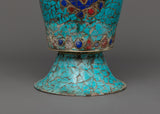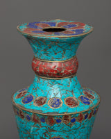 This Turquoise Flower Vase is a gorgeous handcrafted piece that will add elegance and spirituality to any house, altar, or sacred area. This 31cm tall and 14cm broad vase, made of copper and inlaid with artificial stone turquoise, coral, and lapis lazuli, exemplifies Tibetan craftsmanship while holding deep symbolic value.