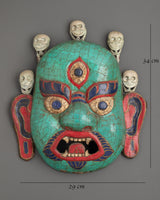 The handcrafted turquoise mask is an excellent example of Tibetan Buddhist workmanship. This traditional mask, 34cm tall and 29cm wide, is skillfully fashioned from copper and embellished with imitation turquoise, lapis lazuli, and coral gemstones. In Tibetan tradition, such masks are thought to repel harmful energy, bestow blessings, and improve spiritual protection.