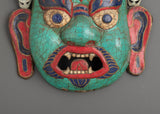 This gorgeous copper mask has elaborate workmanship and brilliant turquoise inlays representing wisdom, healing, and protection. This mask is a potent spiritual relic because it contains lapis lazuli, which means inner calm and enlightenment, and coral, representing life energy and strength. This Tibetan mask is excellent for those who value holy art, Buddhist traditions, and cultural craftsmanship. It can decorate altars, meditation rooms, or as a statement wall piece.