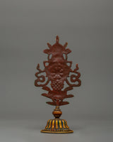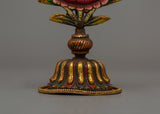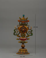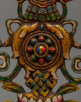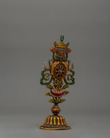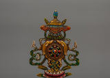 A lotus flower sits between the golden fish and the Dharma wheel at the foot of the structure. It represents purity, enlightenment, and spiritual growth. The lotus serves as a basis for the design, grounding it in its symbolic meaning. The flag-like adornment atop the structure provides a sense of elevation and beauty to the overall design. With its detailed workmanship, brilliant colors, and spiritual symbolism, the overall design is a stunning expression of Buddhist thought and teaching.