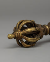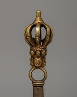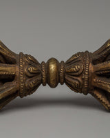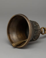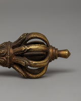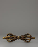 The Vajra is also finely constructed, with intricate workmanship that matches the artistry found on the bell. The vajra signifies the indestructibility of truth, and its shape emphasizes the strength and serenity it represents in Buddhist rites. The bell and vajra complement each other perfectly, with the bell's deity head engraving heightening its holiness and linking it with the spiritual rituals for which both artifacts are commonly utilized. The bronze material and elaborate carvings enhance the set's visual and spiritual appeal, making it an ideal addition to any Buddhist ceremony or collection.