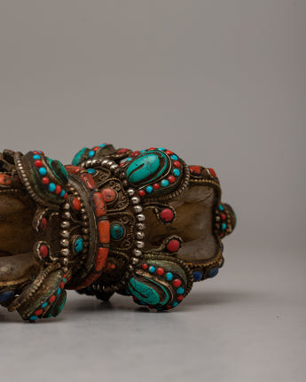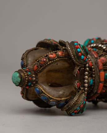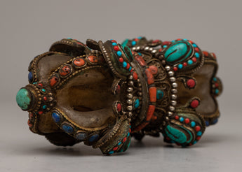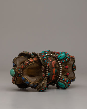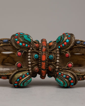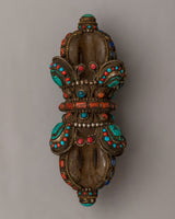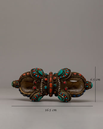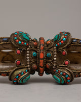 In Buddhist ceremonies, this Vajra Dorje is an effective implement that represents the qualities of a thunderbolt (irresistible force) and a diamond (indestructibility). This artwork is incredibly beautiful and has profound symbolic meaning due to the mix of the inlaid stones' rich hues and sparkling purity. It is the perfect spiritual tool for ceremonial and meditation use, assisting practitioners in focusing their intentions and energies in a visually striking way.