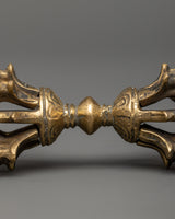 This handcrafted brass Vajra, approximately 16cm in width, is an effective Buddhist ceremonial implement representing indestructible wisdom and spiritual strength. The Vajra, also known as the Dorje, represents the unification of compassion and insight, making it a crucial component in altar setups, meditation practices, and tantric rituals. In Tibetan Buddhism, it is thought to cleanse negative energy, elicit blessings, and aid in spiritual change.