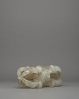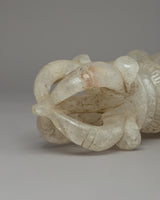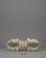 The Vajra Ritual Decor is a highly crafted piece of original crystal quartz, measuring 9 cm in height and 28 cm in width, making it a significant addition to any sacred place. In Tibetan Buddhism, the vajra symbolizes spiritual force and the confluence of wisdom and method. The central spherical hub is delicately carved, with moon disks on either side, lending the piece a distinctive and balanced appearance. The lengthier tips of the vajra are delicately formed, contributing to its mystic and spiritual appeal. The vajra is expertly crafted, with each feature meticulously carved to enhance its meaning.