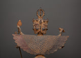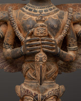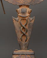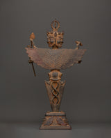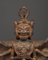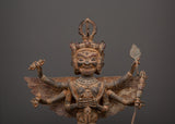 This Vajrakilaya statue with Phurba powerfully portrays the wrathful guardian deity, revered for his capacity to tear through spiritual barriers and remove both inner and external negativity. This Tantric symbol exudes protective energy with wings spread and many arms holding sacred artifacts such as the ceremonial dagger (phurba), vajra, and trident. The base is constructed like a phurba, representing the sharp edge of ignorance and ego.