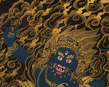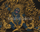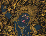 The Black and Gold Vajrapani Thangka is an exquisite piece of art that captures the powerful essence of Vajrapani. The use of black in the thangka symbolizes the ultimate void and the transformation of ignorance into wisdom, while the gold highlights add a radiant and divine quality to the painting. The intricate details and vibrant gold accents emphasize Vajrapani's fierce and dynamic nature, making this thangka a visually striking and spiritually potent tool for meditation.