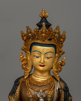 This Vajrasattva, holding an upright Vajra statue that measures 32 cm in height and 20 cm in width, embodies the divine and regal qualities associated with this revered deity in Tibetan Buddhism. The statue's gold plating enhances its intricate design, bringing out the Vajrasattva's sacred aura. His oxidized copper body adds to the aesthetic, with darker tones creating a sharp contrast that emphasizes the figure's detailed craftsmanship. The vibrant colors, meticulous craftsmanship, and gold finish create a sense of divine beauty and tranquility in this piece.