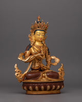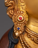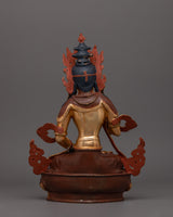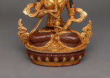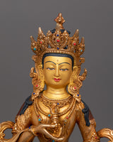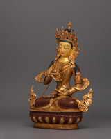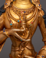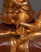 This Vajrasattva Vajra and Bell Holder is a meticulously hand-carved sculpture made of oxidized copper with a gold-plated finish that adds spiritual and aesthetic value. The figure depicts Vajrasattva, the embodiment of purity and compassion, sitting gracefully on a lotus pedestal in meditative pose. Vajrasattva is a popular deity of purification in Tibetan Buddhism, and this statue depicts him holding a vajra (ritual thunderbolt) in one hand and a bell in the other, symbolizing his ability to remove obstacles and purify the mind. The intricate details in the flowing robes and the peaceful expression on his face highlight the skilled craftsmanship that went into their creation.