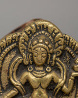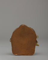 This portable shrine box is intended to house precious relics, mantras, or tiny ritual artifacts, making it a prized possession among spiritual practitioners and collectors alike. The small dimensions (5.5 cm in height and 5 cm in breadth) and lightweight construction (0.054 kg) make it easy to transport, making it perfect for personal usage or decoration. The use of brass and copper parts gives it an old, realistic appearance, highlighting the traditional workmanship and spiritual value.