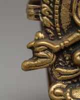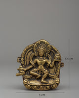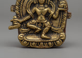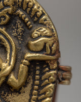 The Vajravarahi Ghau Box is a beautifully handmade Buddhist amulet container made of brass and copper. This traditional Tibetan Ghau has an elaborate relief carving of Vajravarahi, a key deity in Tibetan Buddhism linked with knowledge and change. The front of the box has an intricate image of a deity seated in a dynamic position, holding symbolic qualities that represent power and spiritual enlightenment. The border is embellished with traditional designs, heightening its religious and artistic appeal. The back of the Ghau is smooth and well-crafted, assuring longevity while maintaining its antique appearance.