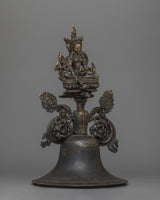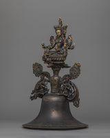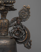 The bell sides are embellished with sculptures of two deities that complement Vasudhara, the central figure. These elaborate representations offer depth and dimension to the entire design, reflecting the diversity of Buddhist art. The intricate carvings capture the essence of spiritual symbolism and add to the bell's opulent appearance, resulting in a gorgeous object.