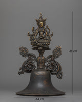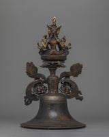 The top of this piece features a finely carved Vasudhara. The bell is brass with an antique finish, giving it a timeless, revered appearance. Vasudhara, the goddess of riches and abundance in Buddhist traditions, is depicted with a tranquil and sympathetic look. Her position, which generally indicates abundance and sharing benefits, adds to the piece's spiritual vibe.