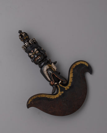 This Kartika, which was created with great care and dedication, has a crescent-shaped blade, which is a Buddhist representation for removing through illusion and ignorance. It's appropriate for ceremonial use as well as personal meditation areas because of the strong iron construction that provides authenticity and longevity. Our Handmade Crescent-Shaped Kartika is a spiritual artifact that can be utilized in rituals or displayed as a symbolic item. Its spiritual importance and craftsmanship enhance the sacred ambiance of any spiritual practice or collection.