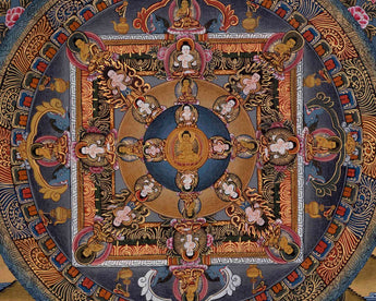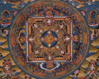 One can use this Buddha mandala as a focal point for meditation and contemplation. By gazing upon this mandala and visualizing oneself within its sacred geometry, practitioners can align with the Buddha's teachings and cultivate a sense of inner balance and harmony. Displaying the mandala in a meditation room or shrine area serves as a reminder of the path to enlightenment and can inspire devotion and mindfulness in daily practice.