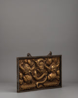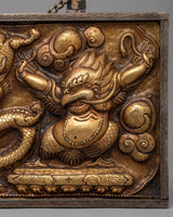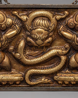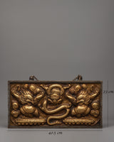 This wall hanging is a decorative item and a profoundly symbolic representation of mythical creatures. It blends power and grace, highlighting finely crafted details in the engraved borders. The piece includes a chain at the top for easy hanging, allowing it to be displayed as a focal point in any sacred or decorative space. This wall hanging will enhance the beauty of any room while bringing a sense of spiritual energy and protection.