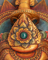 Ganesh's heavenly spirit is displayed through his intricate crown, brilliant colors, and lotus flower designs, which stand for power, protection, and thankful beginnings. A powerful guardian and an impressive focal point for any sacred area, the mask's elaborate design and the "OM" symbol on the forehead highlight spiritual significance. This handcrafted Ganesh mask is a stunning representation of divine blessings and eternal artistry, whether used for ritual purposes, cultural admiration, or as a focus art piece.
