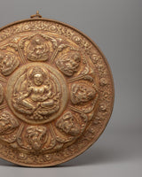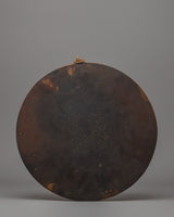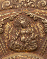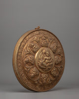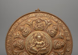 This gorgeous Mandala Wall Hanging Home Decor features a mandala with a copper body and rich gold plating. With a height of 30 cm, a width of 29 cm, and a weight of 1.188 kg, it commands attention in any setting. This intricately crafted mandala is centered on a powerful representation of the deity Dzambhala, connected with wealth and prosperity in Tibetan Buddhism. Dzambhala is shown with a wrathful countenance, indicating his protective and plentiful character. His right-hand holds a citron fruit, representing wealth and success, and his left-hand holds a mongoose, representing the exchange of treasures.