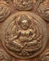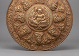 Nine more miniature depictions of the deity, each skillfully carved into a circular pattern, surround the primary Dzambhala. The repeated use of Dzambhala around the central figure symbolizes the deity's power and influence, spreading abundance and protection throughout the area. Delicate floral carvings along the edge of the mandala enrich the pattern, bringing an exquisite and tranquil touch to the item. The rich workmanship emphasizes Dzambhala's role in providing worldly and spiritual wealth to people who seek his blessing.