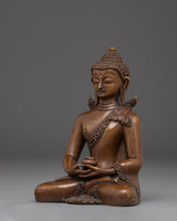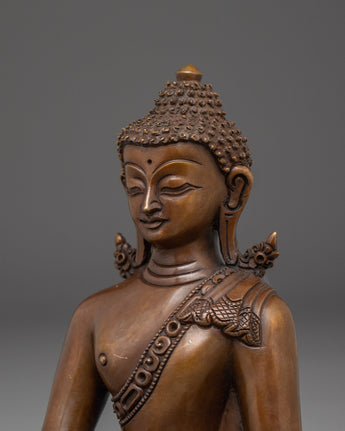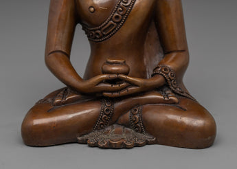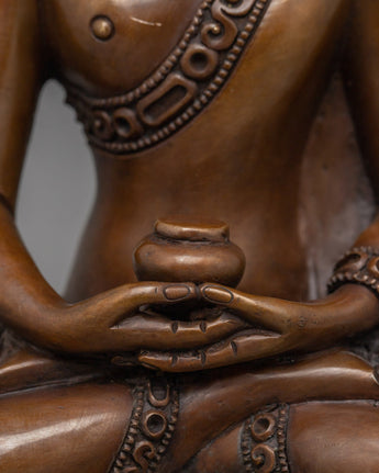 Western Paradise Deity Amitabha Buddha stands 6.3 inches (16 cm) tall with a base measuring 4.5 inches (11.5 cm), and weighs 0.79 kilograms, offering a modest but meaningful presence. Crafted from an oxidized copper body, it features a dark, antique-style finish that enhances its traditional appeal and accentuates the fine detailing. The oxidized surface gives the piece a timeless character, making it ideal for personal altars, small meditation spaces, or as a thoughtful spiritual gift. Despite its size, the statue reflects the depth and elegance of Himalayan craftsmanship.