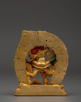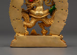 This finely carved White Dzambhala Statue is 11.5 cm tall and weighs 0.36 kilograms. It's made of copper and gold-plated, with delicate embellishments like brilliant acrylic color accents. White Dzambhala is represented in his royal form, sitting atop a dragon and holding a mongoose in his left hand. The dragon underneath him indicates power, protection, and the capacity to overcome obstacles, while the mongoose denotes abundance of money and the ability to create success. This potent mix of symbols strikes an ideal balance between material prosperity and spiritual growth.
