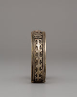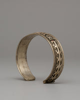 Recognize this White Metal Buddhist Cuff's spiritual energy, carefully handcrafted with the Buddhist teachings' central mantra, Om Mani Padme Hum. This 1.5cm tall cuff-style bracelet is made of white metal and has a 21cm circumference, making it a comfortable and important accessory. Skilled artisans meticulously engrave each detail, emphasizing its cultural legacy and spiritual value.