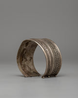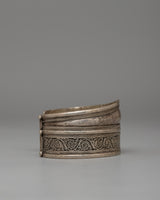 With dimensions of 4 cm in height, 6.5 cm in breadth, and 20 cm in diameter, this bracelet is an example of expertly crafted jewelry. It is made of white metal, with a distinctive patina that adds to its vintage elegance, and weighs only 0.034 kg. This filigree bracelet's classic style and cultural importance will make it an attractive addition to your jewelry collection or a considerate present for a special someone.