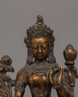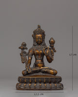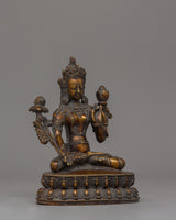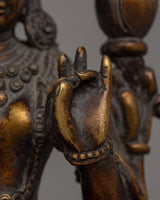 Accept the soothing and loving energy of White Tara, the goddess of longevity and compassion. This elaborately hand-carved statue, made of solid copper and embellished with a timeless antique finish, is an excellent addition to your holy place. The delicate craftsmanship and tranquil stance of White Tara exude serenity and spiritual connection, making it a great centerpiece for meditation or prayer.