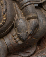 The wood-carved White Dzambhala sculpture is a sacred and detailed representation of this revered deity. At 65 cm tall and 7.78 kg, it embodies strength, wisdom, and spiritual abundance. Dzambhala wears a five-jeweled crown, symbolizing his enlightened status. His fierce expression reflects his role as a protector, removing obstacles and bringing prosperity. A snake around his neck represents control over negativity and transformation, while he sits atop a dragon, symbolizing power and resilience. The lotus base signifies purity and spiritual enlightenment.