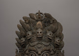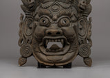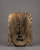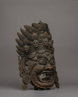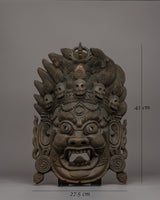 Bhairava's iconography is highly symbolic, representing his wrathful look, wide eyes, and offered fangs, which represent the ability to destroy fear and ego. His skull cap denotes the liberation from worldly attachments, while his flowing, flame-like hair represents divine energy and the demise of ignorance. Bhairava is honored as a guardian deity in Hindu and Buddhist Tantric traditions, safeguarding temples, houses, and practitioners from harm. This handcrafted wall mask is an artistic beauty and a potent spiritual tool that brings courage, knowledge, and transformation into your home.
