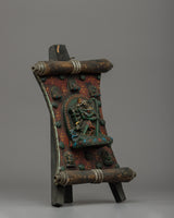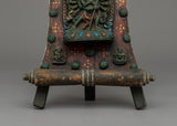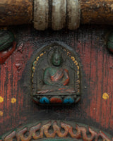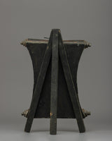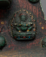 The Wooden Chakrasambhara Thangka combines traditional resin artwork with a solid wooden frame, giving it a distinct appearance. The vibrant colors and intricate detailing are striking, with the central figure of Chakrasambhara prominently carved into the resin. The statue is framed by four wooden rolls, which give the piece an ancient, scroll-like quality. The resin carving highlights the deity's fine details, emphasizing the expressions of strength and serenity. Chakrasambhara's green skin represents transformation, and his posture and arm positioning convey energy and movement, emphasizing his role as the deity of spiritual growth.