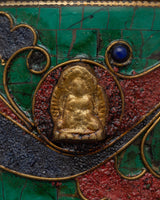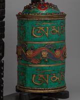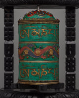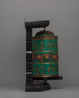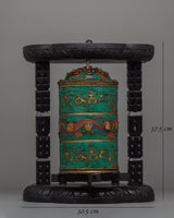 The Wooden Frame Tibetan Prayer Wheel is a beautifully handcrafted spiritual artifact designed to embody the essence of Tibetan Buddhist traditions. Encased in an intricately carved wooden frame, the prayer wheel is adorned with turquoise and stone powder inlays, giving it an authentic and vibrant appearance. The cylindrical body is crafted from copper, featuring finely embossed Tibetan script and sacred motifs, symbolizing prayers and mantras. Measuring 37.5 cm in height and 30.5 cm in width, the structure is a stunning decorative piece, blending spiritual significance with remarkable craftsmanship.