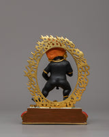 Wrathful Black Dzambhala Statue, a powerful representation of the Buddhist wealth deity. This finely crafted statue, which stands 10.5cm tall and 8cm wide, is made of gold-plated copper and features hand-painted acrylic details, giving it a distinct and eye-catching appearance. Dzambhala is revered for bestowing prosperity, overcoming financial obstacles, and protecting devotees from poverty, so this statue is an essential addition to any altar, meditation space, or spiritual collection.