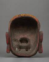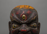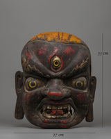 This wrathful mask is made of wood, measuring 33 cm tall and 27 cm broad. It is designed with a furious expression to convey strength and dominance. One of its most distinguishing traits is the third eye on the forehead, commonly seen in wrathful deities. This third eye adds a magical touch, creating the idea that the mask can see beyond the physical realm. The firm, arched brows add to the intense expression, producing a sense of authority and control.