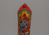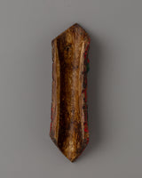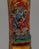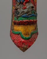 This Yamantaka apron decoration, which features the deity surrounded by fire transformational force, is expertly carved by Himalayan artists in every detail. The striking artwork, hand-painted with colorful acrylics, guarantees longevity and aesthetic appeal. This one-of-a-kind item reflects the rich cultural legacy and devotion of Tibetan art, whether utilized for Buddhist ceremonies, meditation exercises, or as an effective supplement to spiritual attire.