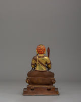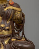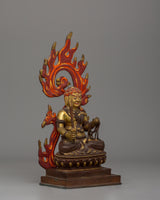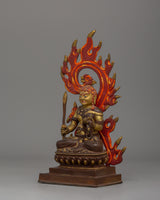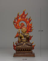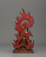 This statue of Yamaraj is shown in a forceful, wrathful attitude, encircled by a coiled, blazing aura representing his power over life and death. His angry visage, which includes sharp fangs, indicates his role in eradicating evil forces and paving the path for spiritual change. Yamaraj carries a rope in his left hand, symbolizing his ability to bind beings in the cycle of samsara, and a sword in his right, representing his ability to destroy attachments and ignorance. The vivid flames around him heighten his dominating presence, representing both his wrathful and protective energies.