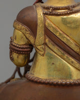 This handcrafted Yamaraj statue, measuring 21cm tall and 13cm broad, is an intense Tibetan Buddhist portrayal of Yama, the Lord of Death and Dharma Protector. It is made of oxidized copper with gold plating and acrylic details and weighs 1.378kg. This elaborately sculpted statue would be an excellent addition to altars, meditation rooms, or religious decor collections.